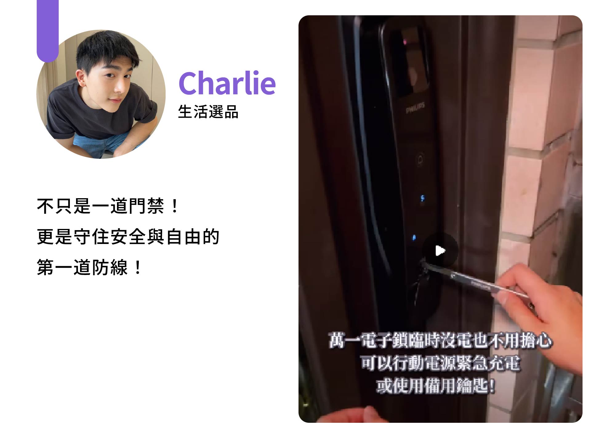 請注意:飛利浦電子鎖全系列皆有備用機械鑰匙,不會有被鎖在門外的風險。