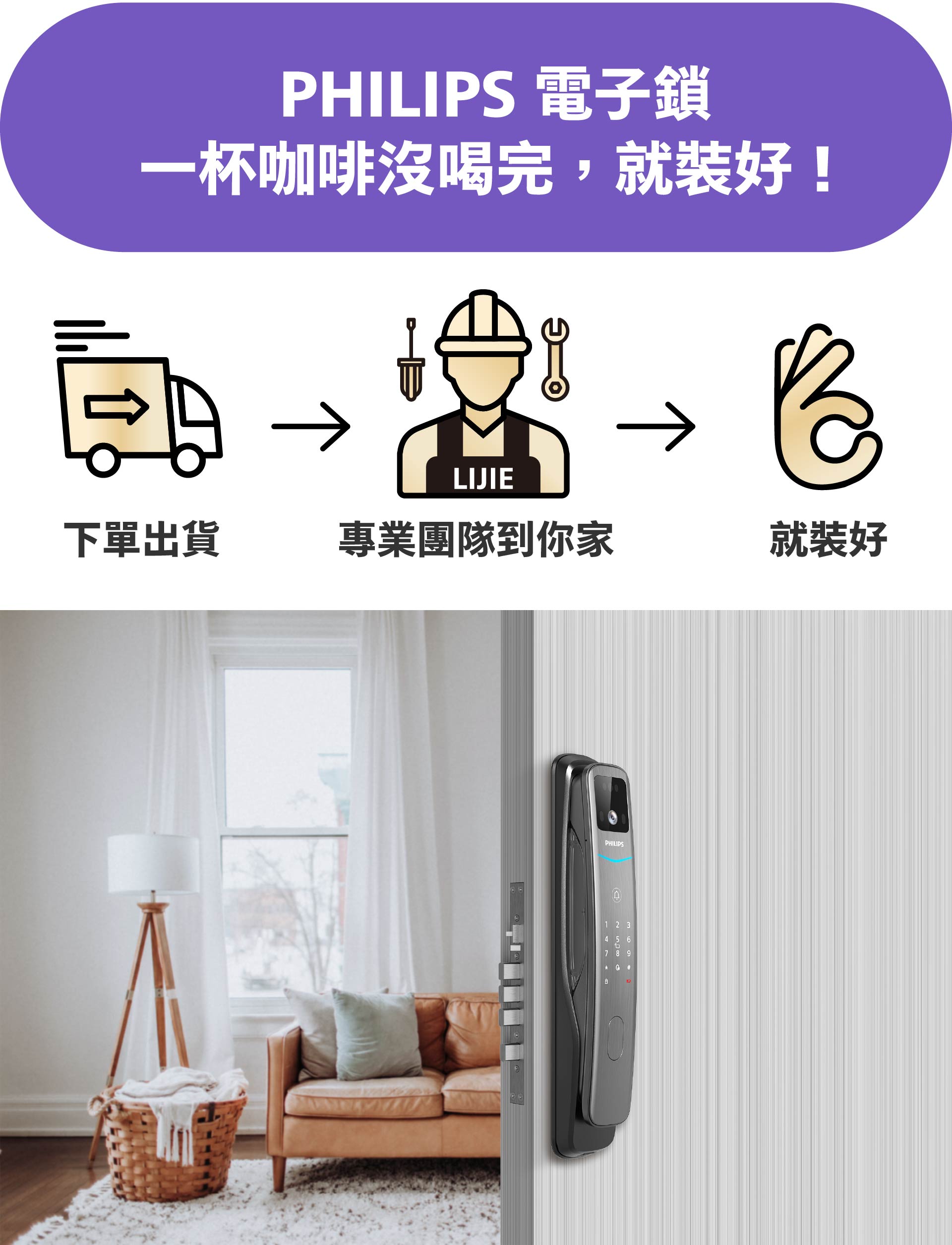 - 飛利浦電子鎖享原廠三年保固,若非人為因素造成的異常,可享有免費維修服務。